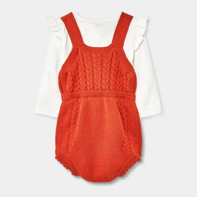 Whether you’re looking for a gift or refreshing your baby’s wardrobe, the Sweater Romper with Cable T-Shirt Set from Cat & Jack™ will make a cute choice for your needs. This baby outfit set includes a white long-sleeve T-shirt with ruffles along the shoulders and a contrasting sweater romper with cable-knit detailing for cozy style. The crotch snaps make dressing and changing easier and the soft fabric helps keep your little one comfortable.
