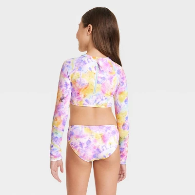Add splashing cool style to your kid’s swimwear with the 2-Piece Tie-Dye Bikini Set from Cat & Jack™. This bikini set includes a long-sleeve rashguard pullover as well as a swim bottom, both covered with a tie-dye pattern for an eye-catching look. Both the pieces are made with a mix of soft and stretchy fabric with full lining for comfy movement both in and out of the water, and with UPF 50+ rated fabric, your kid will also get some extra protection from the sun.