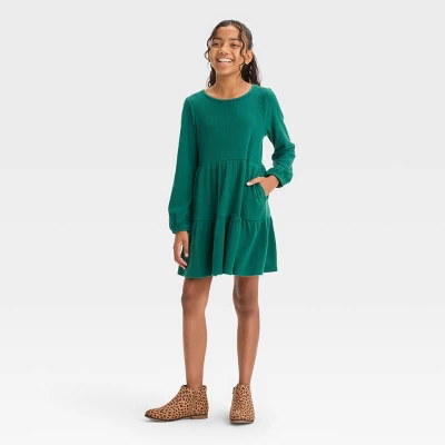 Add texture and style to your kiddo’s cool-weather look with this Long-Sleeve Cozy Dress from Cat & Jack™. This cozy long-sleeve dress in a solid color features a casual crewneck, a tiered style and a variegated ribbed design. The lightweight thermal fabric with added stretch offers them a cozy and comfortable fit, while the pullover round neck makes dressing them a breeze. Plus, the side seam pockets at functional flair.
